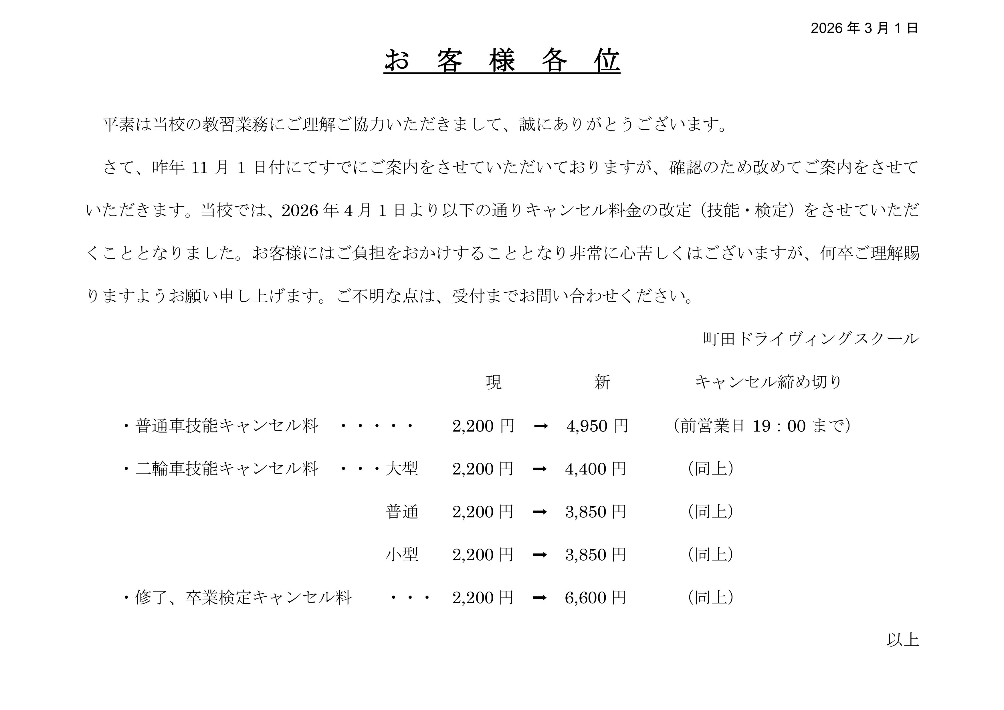 キャンセル料金変更のお知らせ